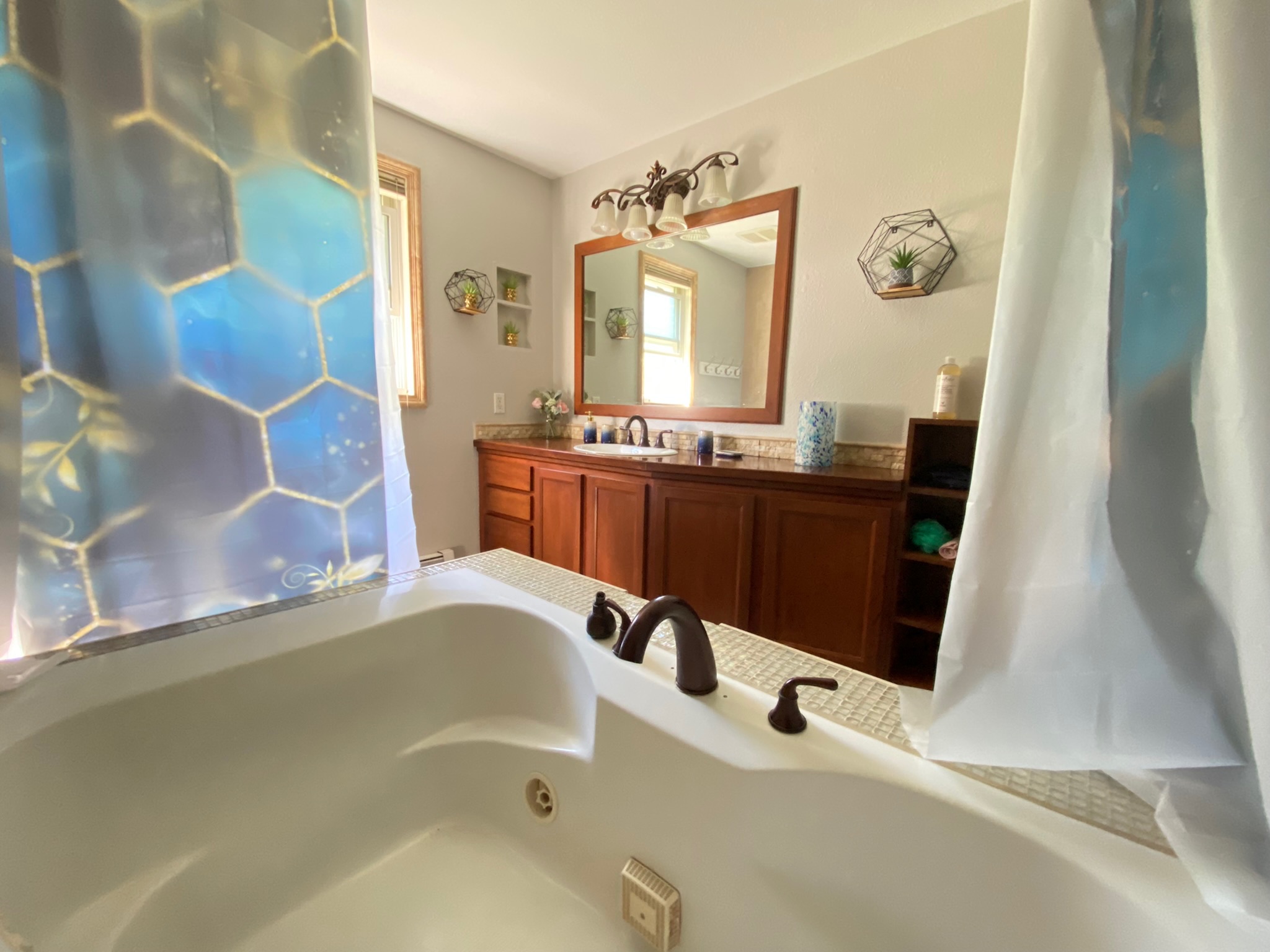 Enter a well-decorated house with 2 fully-stocked kitchens, 2 dining rooms, 2 living rooms, 5 bathrooms, etc.
